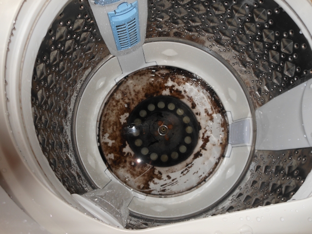 - 洗濯槽に黒カビが目立つ